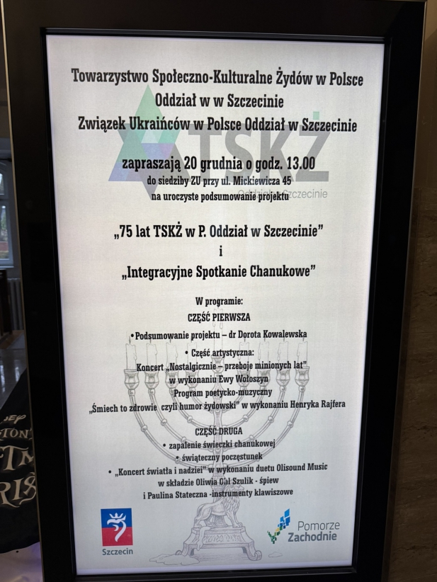 W dniu 20 grudnia 2025 roku, w siedzibie Towarzystwa Społeczno-Kulturalnego Żydów w Polsce, Oddział w Szczecinie, odbyło się Integracyjne Spotkanie Chanukowe. Wydarzenie to miało na celu podsumowanie projektu związanego z obchodami 75-lecia działalności Towarzystwa Społeczno-Kulturalnego Żydów w Polsce w Szczecinie.