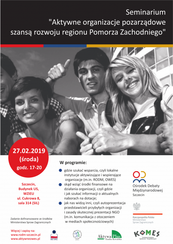 Organizatorzy zapraszają zachodniopomorskie podmioty ekonomii społecznej tj. m.in. fundacje, stowarzyszenia, spółdzielnie socjalne na Seminarium „Aktywne organizacje pozarządowe szansą rozwoju regionu Pomorza Zachodniego”, organizowane w ramach projektu „Regionalny Ośrodek Debaty Międzynarodowej w Szczecinie”.