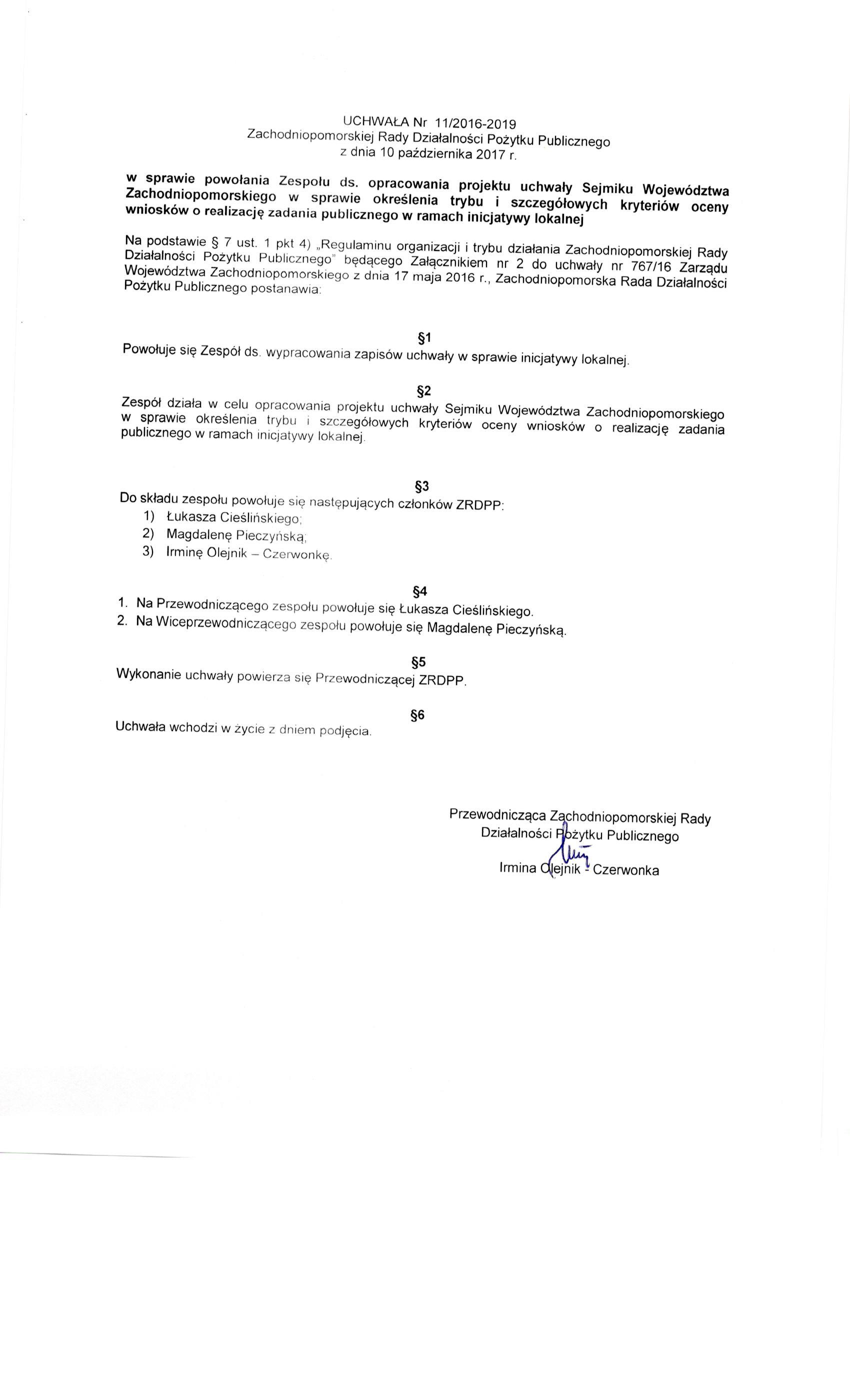 a) powołania Zespołu ds. opracowania projektu uchwały Sejmiku Województwa Zachodniopomorskiego w sprawie określenia trybu i szczegółowych kryteriów oceny wniosków o realizację zadania publicznego w ramach inicjatywy lokalnej;