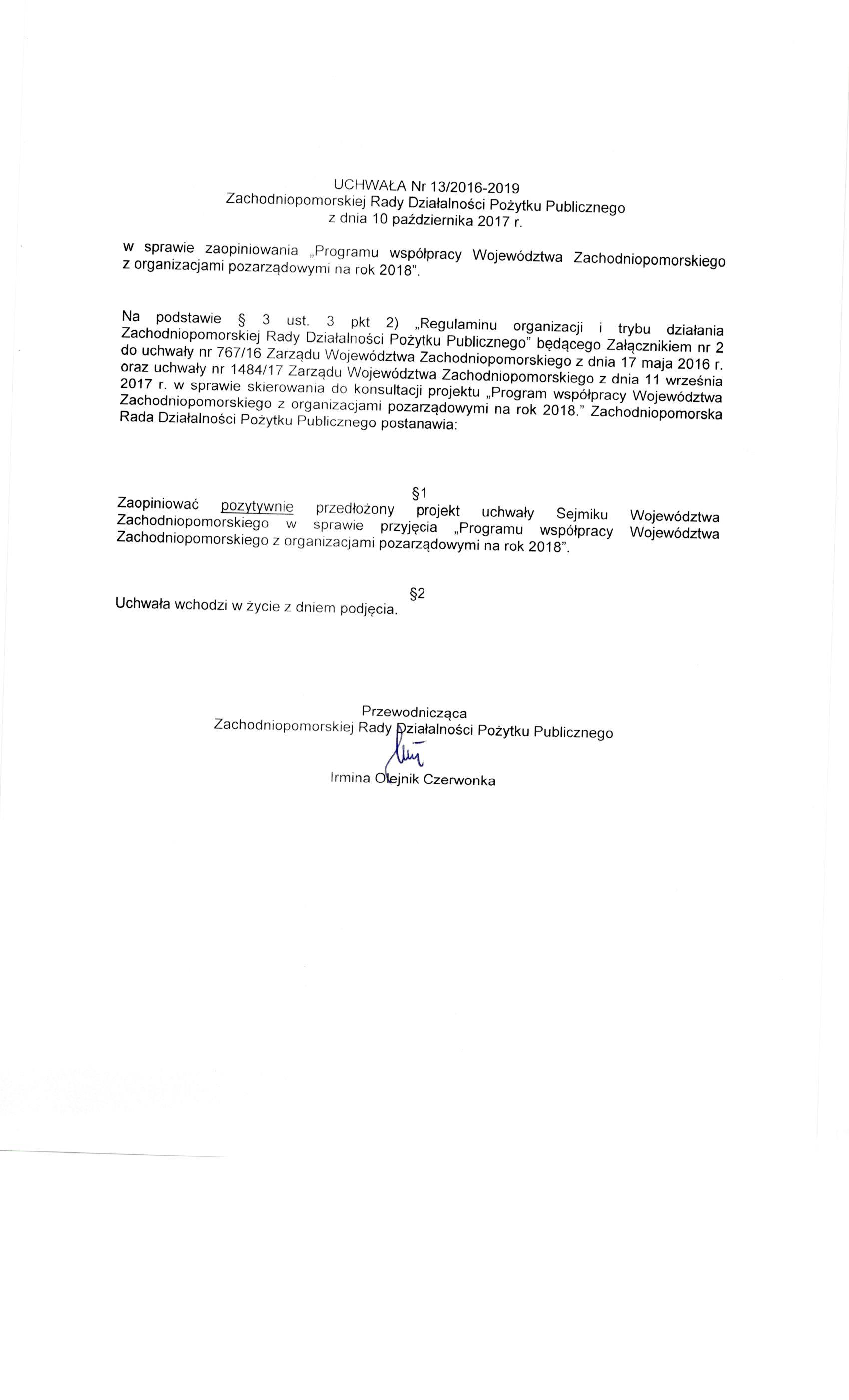 c) zaopiniowania przez Zachodniopomorską Radę Działalności Pożytku Publicznego projektu Programu Współpracy Województwa Zachodniopomorskiego z organizacjami pozarządowymi na rok 2018;