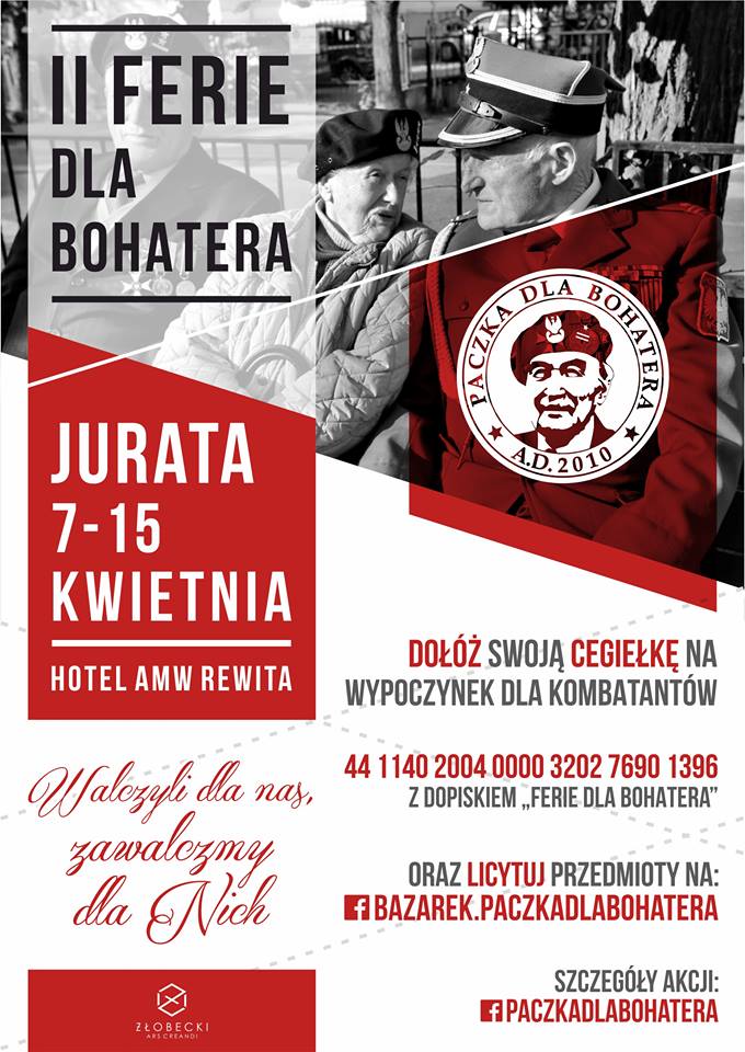 Stowarzyszenie Paczka dla Bohatera zaprasza do wsparcia akcji organizacji II Ferii dla Bohatera poprzez przekazanie przedmiotów (książek, pamiątek, gadżetów firmowych, różnych przedmiotów, usług itp.) w celu wystawienia ich na naszych aukcjach charytatywnych prowadzonych na Bazarku dla Bohatera – bazarek.paczkadlabohatera. Cały dochód przeznaczony zostanie na Ferie dla Bohaterów.