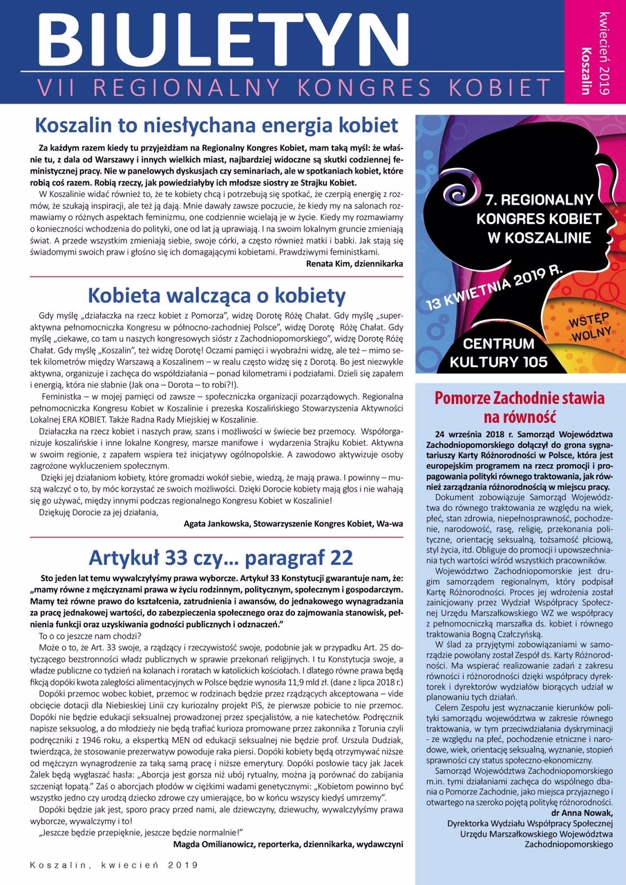 Zachęcamy do zapoznania się z kwietniowym wydaniem koszalińskiego biuletynu, w którym znajdą Państwo m.in. artykuły nt. „Koszalin to niesłychana energia kobiet”, „Kobieta walcząca o kobiety”, „Artykuł 33 czy … paragraf 22”, a także o Karcie Różnorodności na Pomorzu Zachodnim.