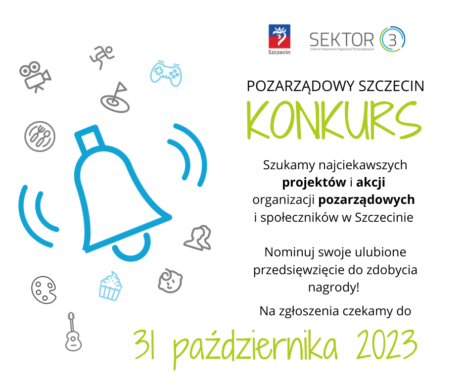 Nagrody przyznane zostaną w kategoriach: inicjatywa na rzecz określonej przez organizację pozarządową grupy, inicjatywa uczestnika podejmowana wraz z mieszkańcami, (zaangażowanie w akcję mieszkańców jest jego kluczowym elementem). Nagrodą główną, w każdej kategorii jest bon o wartości 3000 zł brutto. Organizatorem Konkursu pn. „Pozarządowy Szczecin” jest Fundacja Sektor 3 poprzez Centrum Wspierania Organizacji Pozarządowych Sektor 3 z siedzibą w Szczecinie oraz Gmina Miasto Szczecin.Szczegóły na stronie: https://bip.um.szczecin.pl/chapter_11190.asp?soid=2997CF77F7514BA08F5BAC247E2FEF75