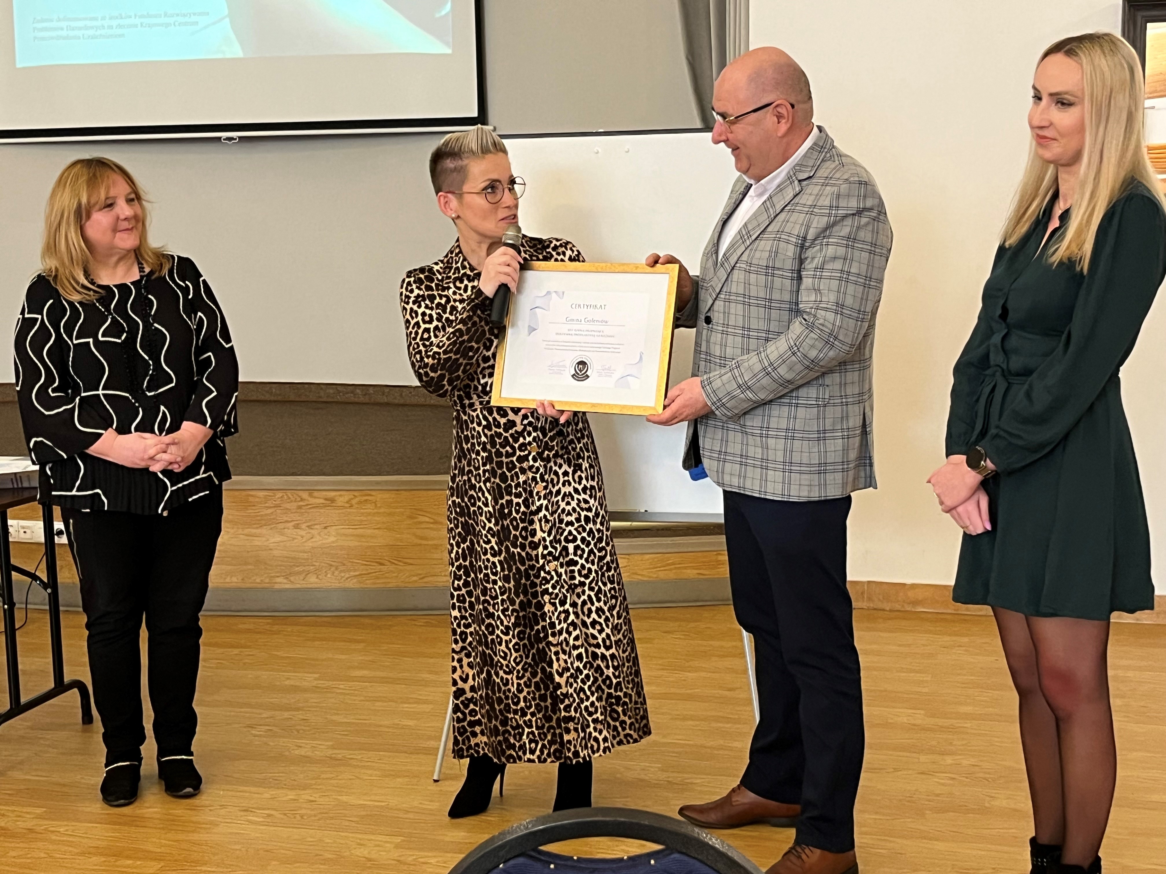Podczas spotkania Gmina Goleniów otrzymała od Fundacji Instytut Nowej Kultury certyfikat „Gminy promującą efektywną profilaktykę uzależnień”.