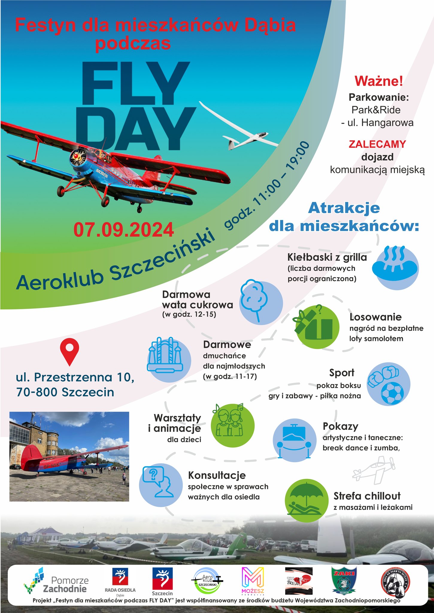 Przygotowano też strefę familijną – catering, dmuchane zamki, warsztaty i animacje dla dzieci, pokazy artystyczne i taneczne, konkursy z nagrodami – m.in. bezpłatne bilety na loty samolotem An-2.