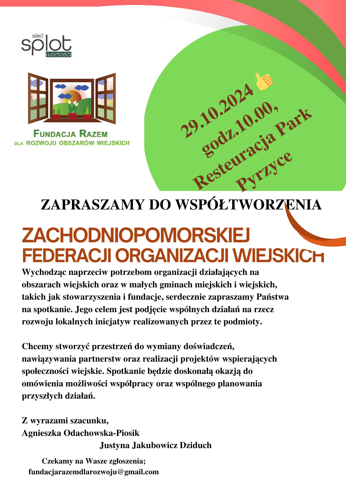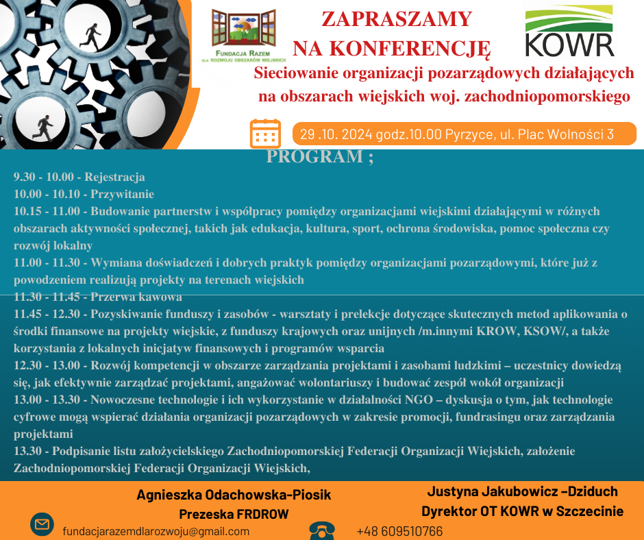 Fundacja Razem dla rozwoju obszarów wiejskich Agnieszki Odachowskiej - Piosik , zaprasza na Konferencję Sieciowanie organizacji pozarządowych działających na obszarach wiejskich woj. zachodniopomorskiego, która odbędzie się w Pyrzycach w dniu 29 października 2024. Efektem tej konferencji ma być powstanie Zachodniopomorskiej Federacji Organizacji Wiejskich. Zachęcamy do udziału. Szczegóły znajdują się w zaproszeniu, załaczamy też Program wydarzenia.