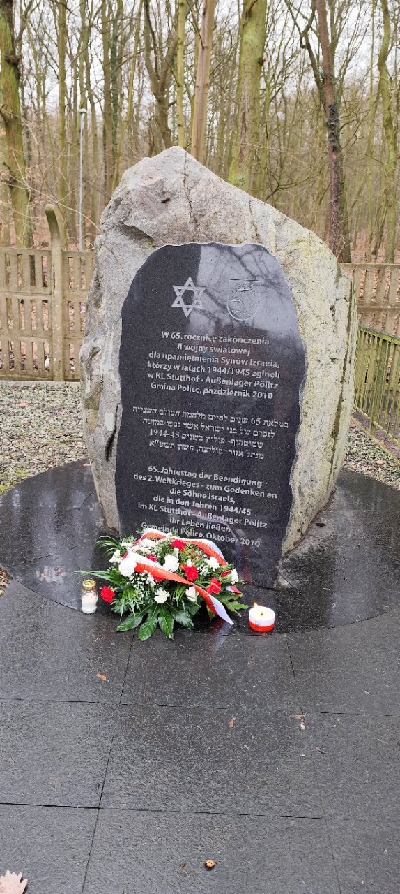 Pomnik upamiętniający "Synów Izraela" - ofiary KL Stutthof - Aussenlager Pölitz został umieszczony tutaj w 65. rocznicę zakończenia II wojny światowej, w październiku 2010 roku.