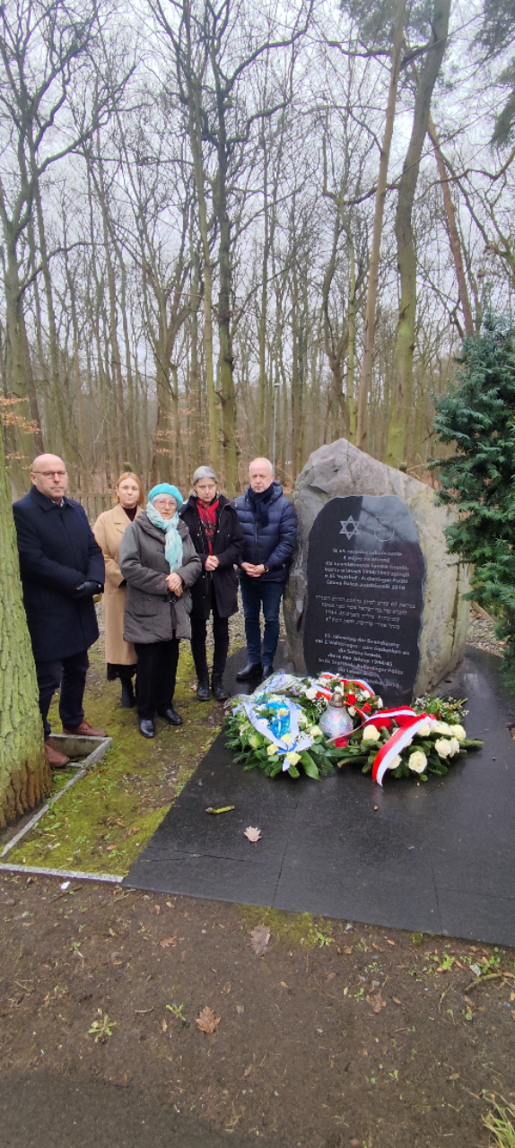 Kwiaty dla upamiętnienia ofiar pod pomnikiem pamięci poświęconym żydowskim ofiarom KL Stutthof złożyli przedstawiciele Wydziału Współpracy Społecznej : Edyta Guzikiewicz, Marek Karapuda oraz przewodnicząca szczecińskiego oddziału Towarzystwa Społeczno- Kulturalnego Żydów w Polsce Róża Król.