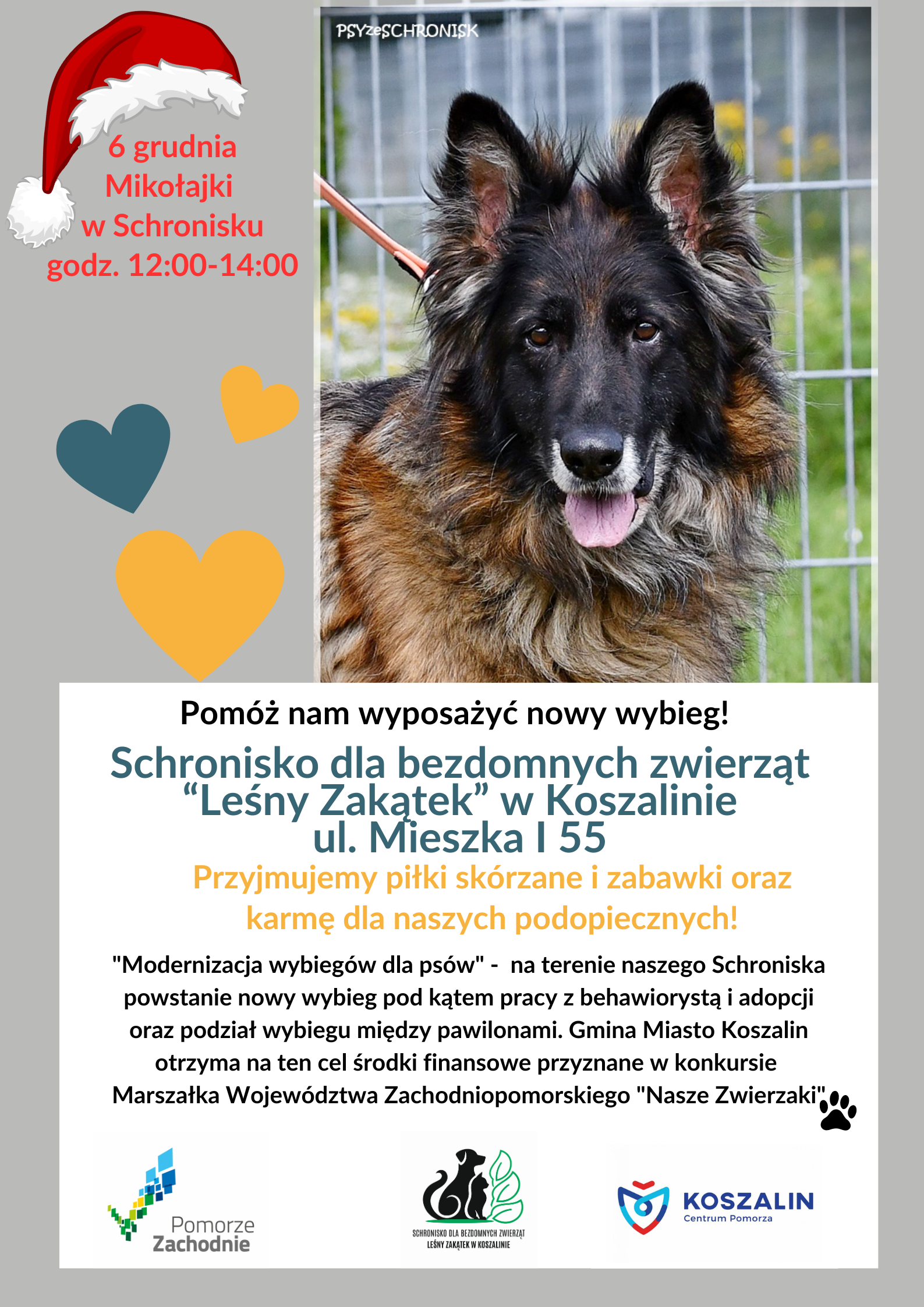 Już wkrótce dodatkowa okazja, by odwiedzić schronisko i poznać jego mieszkańców! 6 grudnia,w godz. 12:00-14:00, Mikołajki w „Leśnym Zakątku” przy ul. Mieszka I 55 w Koszalinie. To dobry moment, by spędzić czas ze zwierzakami, dowiedzieć się więcej o ich potrzebach i wesprzeć schronisko w codziennej pracy.
