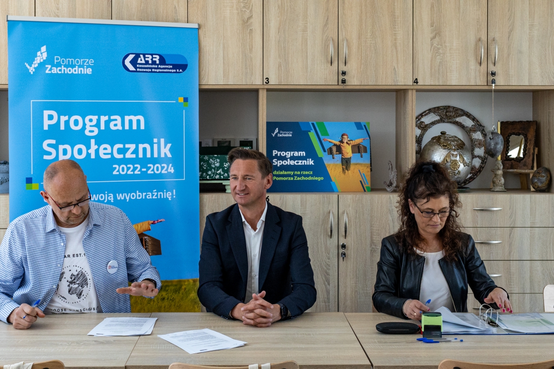 podpisanie umów z programu społecznik. za stołem trzy osoby