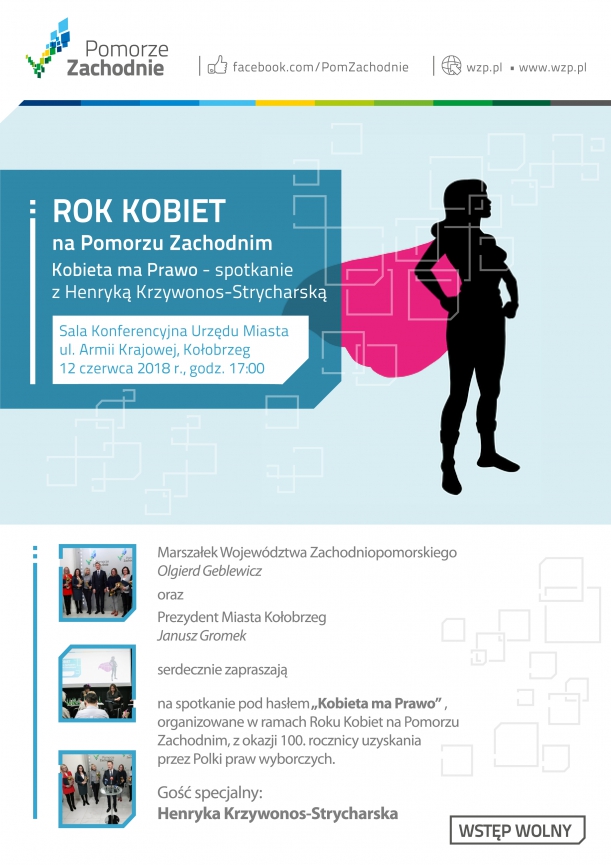 Marszałek Województwa Zachodniopomorskiego Olgierd Geblewicz zaprasza na spotkanie pod hasłem „Kobieta ma Prawo” organizowane w ramach Roku Kobiet na Pomorzu Zachodnim z okazji 100 rocznicy uzyskania przez Polki praw wyborczych.