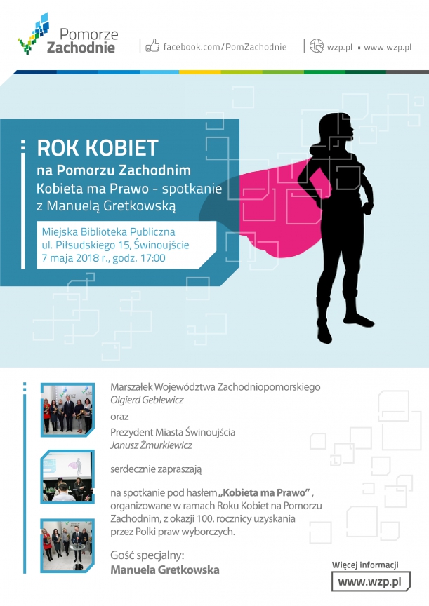 Marszałek Województwa Zachodniopomorskiego Olgierd Geblewicz oraz Prezydent Miasta Świnoujście Janusz Żmurkiewicz zapraszają na spotkanie pod hasłem „Kobieta ma Prawo” organizowane w ramach Roku Kobiet na Pomorzu Zachodnim z okazji 100. rocznicy uzyskania przez Polki praw wyborczych.