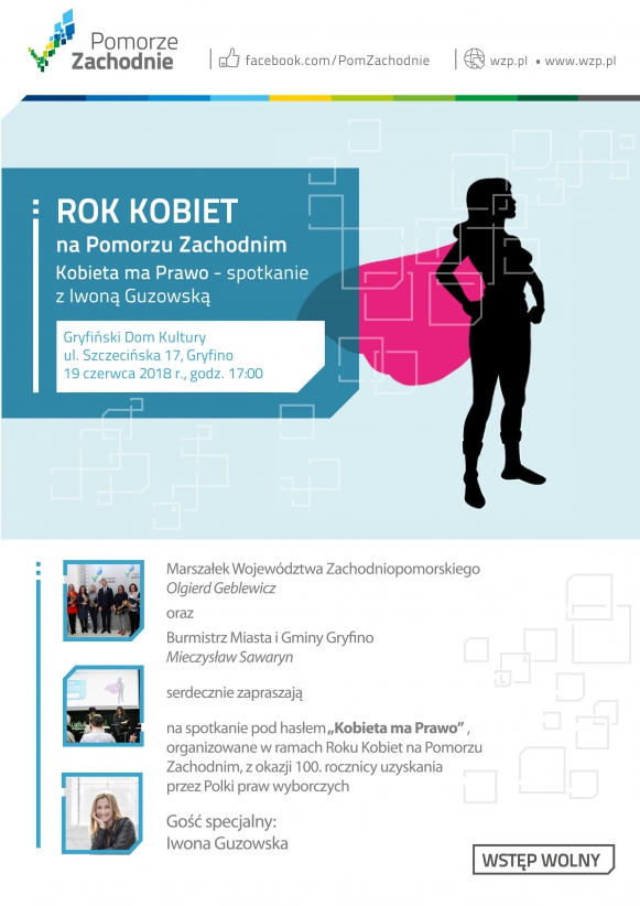 Marszałek Województwa Zachodniopomorskiego Olgierd Geblewicz oraz Burmistrz Miasta i Gminy Gryfino Mieczysław Sawaryn zapraszają na spotkanie organizowane w ramach Roku Kobiet na Pomorzu Zachodnim z okazji 100. rocznicy uzyskania przez Polki praw wyborczych.